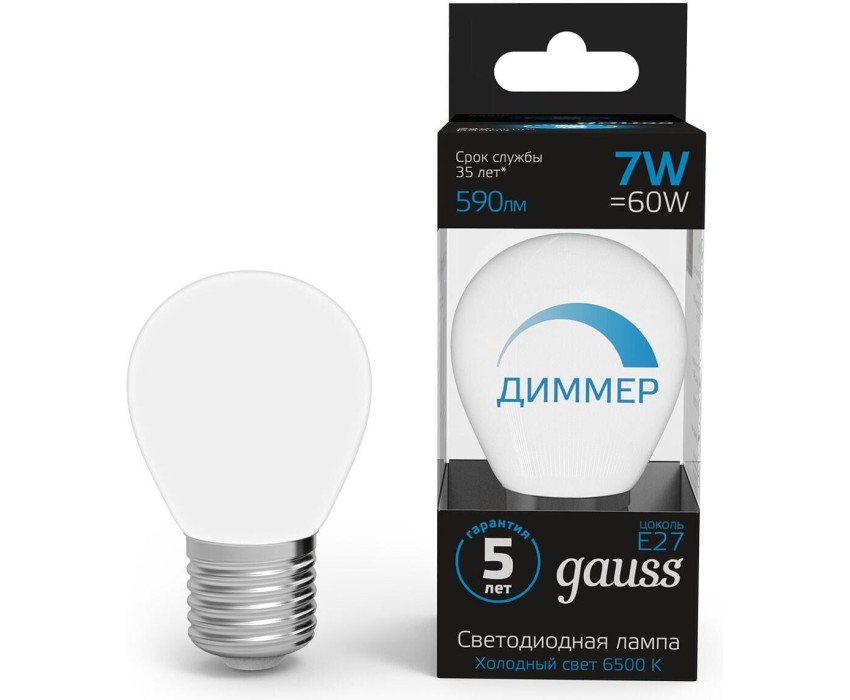 Тип товара: светодиодная Бренд: GAUSS PartNumber/Артикул Производителя: 105102307-D Модель: 105102307-D Световой поток: 590 lm Максимальный срок службы: 35000 ч Угол светового пучка: 240 ° Матовая: ДА Класс энергоэффективности: A+ Диаметр: 45 мм Высота товара: 75 мм Патрон: E27 Количество ламп: 1 шт Цветовая температура: 6500 К Диммер: ДА Цвет свечения: белый холодный Индекс цветопередачи: 90 Тип лампы: светодиодная Степень защиты: IP20 Мощность: 7 Вт Вес упаковки (ед): 0.057 кг Габариты упаковки (ед) ДхШхВ: 0.05x0.05x0.135 м Объем упаковки (ед): 0.0003375 м3 Напряжение питания: 150 В