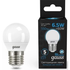 GAUSS Лампа светодиодная 105102307 6.5Вт цок.:E27 шар 220B св.свеч.бел.хол. (упак.:10шт)