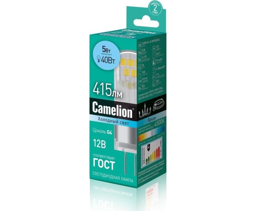СДЛ Camelion - это инновационное решение, разработанное на основе новейших светодиодных технологий (LED). Предназначена для освещения жилых, офисных и коммерческих помещений. Встроенный источник питания позволяет использовать СДЛ Camelion в стандартных патронах. LED лампа, мощность, Вт - 5, напряжение, В - 12, световой поток, лм - 415, форма колбы - капсула, цвет колбы - прозрачный, цоколь G4, цветовая температура, К - 4500, угол светового пучка - 330, индекс цветопередачи 80+, срок службы, ч. - 30000, Без пульсации. Рифленый рассеиватель обеспечивает мягкое рассеяное свечение "без точек"