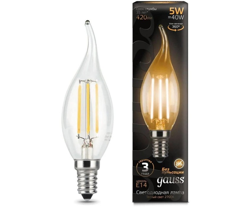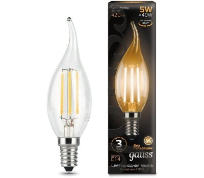 GAUSS Лампа филам. Filament 5Вт цок.:E14 свеча 220B св.свеч.бел.теп. (упак.:10шт) (104801105)