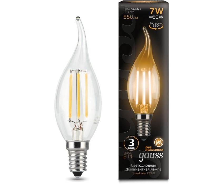 Бренд: GAUSS Тип товара: светодиодная PartNumber/Артикул Производителя: 104801107 Энергосберегающая: ДА Световой поток: 550 lm Максимальный срок службы: 35000 ч Описание: Светодиодная лампа Gauss - самый безопасный для здоровья и окружающей среды источник света. Она не пульсирует, мгновенно включается, не содержит ртути, и имеет больший срок службы, чем лампы накаливания и КЛЛ. Колба: CF35 Угол светового пучка: 360 ° Класс энергоэффективности: A+ Габариты упаковки (ед) ДхШхВ: 0.13x0.04x0.04 м Вес упаковки (ед): 0.029 кг Объем упаковки (ед): 0.000208 м3 Серия: Filament Патрон: E14 Количество ламп: 1 шт Цветовая температура: 2700 К Цвет свечения: белый теплый Индекс цветопередачи: 90 Тип лампы: светодиодная Степень защиты: IP20 Мощность: 7 Вт Напряжение питания: 220 В