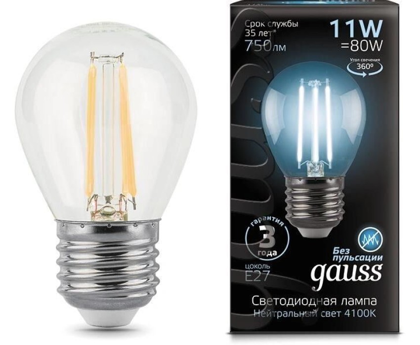 GAUSS Лампа светодиодная Filament 11Вт цок.:E27 шар 220B св.свеч.бел.нейт. (упак.:1шт) (105802211)