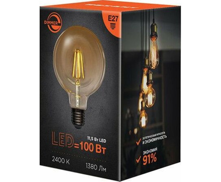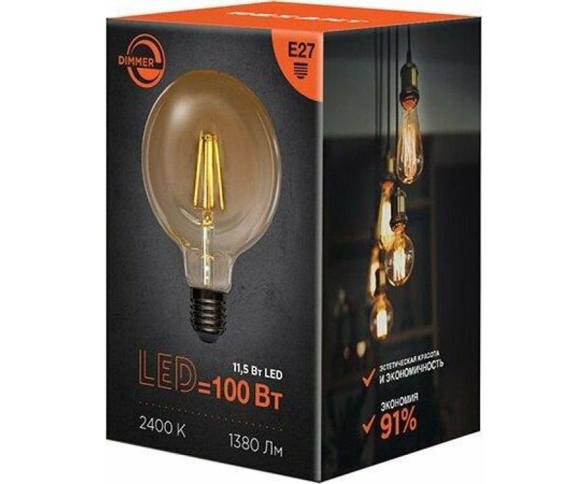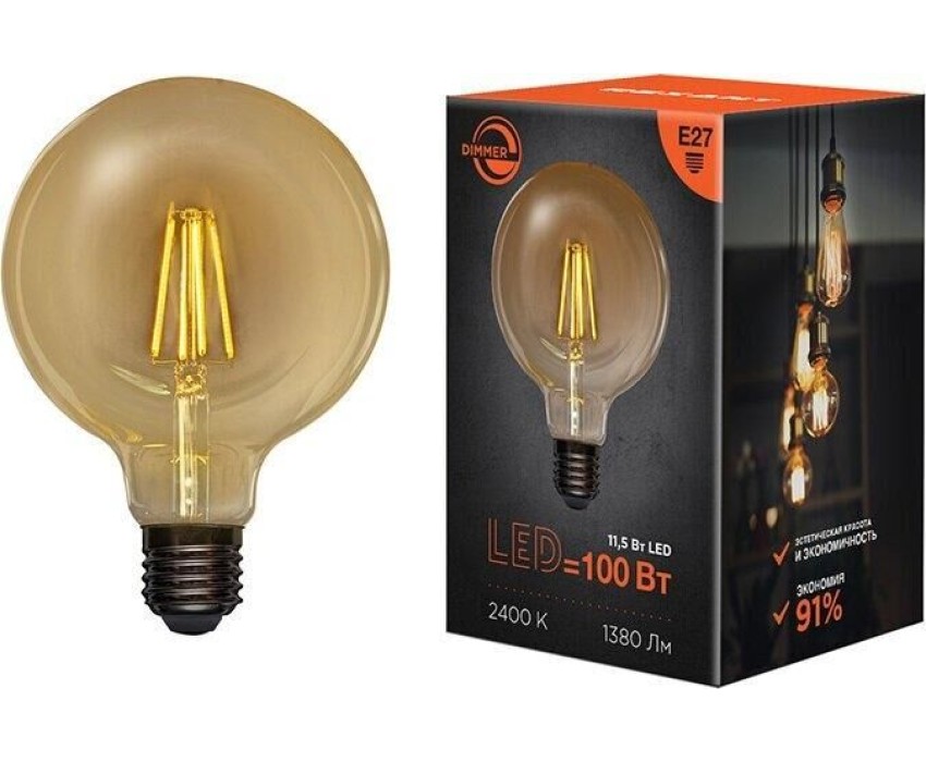 Филаментная прозрачная лампа REXANT A125 в форме груши мощностью 11.5Вт с цоколем E27 и с теплым белым свечением в 2700K прекрасно подходит для дизайнерского освещения комнат, домов, гостиниц, кафе, и других объектов. Филаментные светодиодные лампочки вобрали в себя все лучшие свойства, присущие матричным LED-лампам и традиционным лампам накаливания. Они обладают высокой энергоэффективностью и долгим сроком службы. За счет распространения света во всех направлениях, филаментные лампочки REXANT потребляют еще меньше электроэнергии при более высокой яркости. Утилизации ламп не требует особых мер. Их можно вынести с бытовыми отходами, так как они безопасны и для окружающей среды. Яркость свечения филаментной лампы можно отрегулировать при помощи диммера.