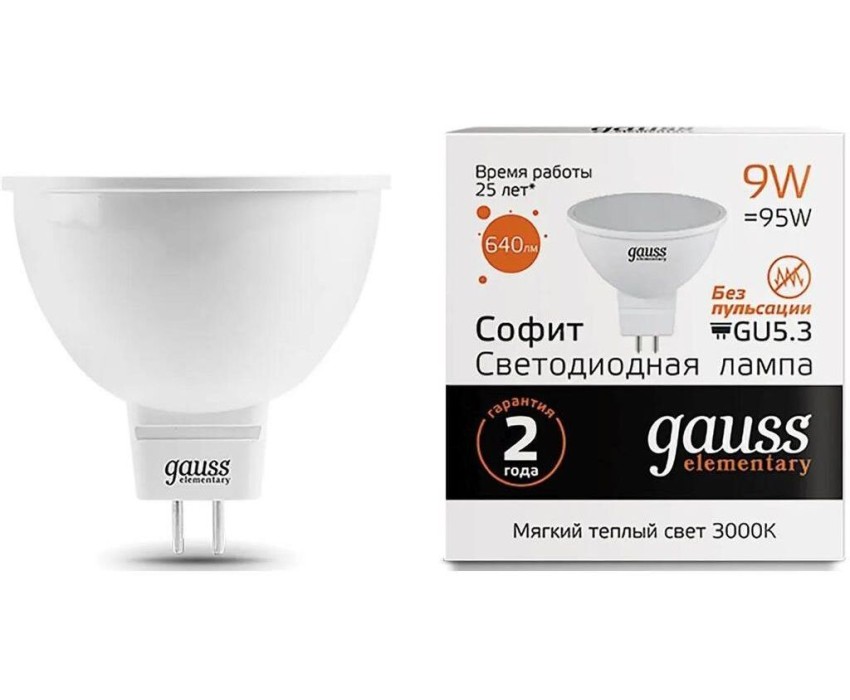 GAUSS Лампа светодиодная Elementary MR16 9Вт цок.:GU5.3 спот 220B св.свеч.бел.теп. MR16 (упак.:10шт) (13519)