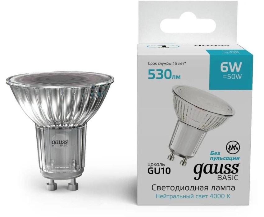 GAUSS Лампа светодиодная Basic 6Вт цок.:GU10 софит 220B св.свеч.бел.нейт. (упак.:10шт) (10106262)