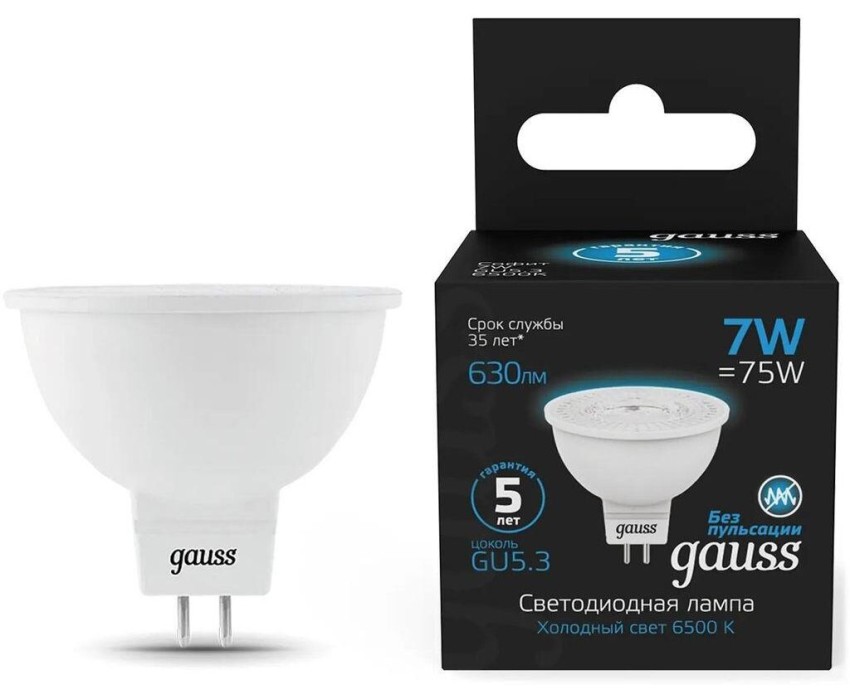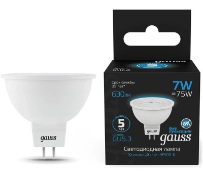 GAUSS Лампа светодиодная 101505307 7Вт цок.:GU5.3 рефлек. 220B св.свеч.бел.хол. MR16 (упак.:10шт)