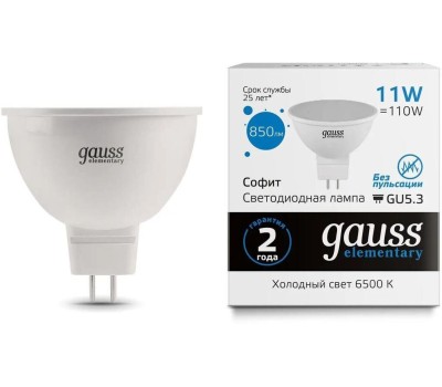GAUSS Лампа светодиодная Elementary 13531 11Вт цок.:GU5.3 софит 180B св.свеч.бел.хол. MR16 (упак.:1шт)