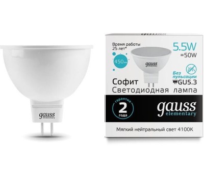 GAUSS Лампа светодиодная Elementary MR16 5.5Вт цок.:GU5.3 спот 220B св.свеч.бел.нейт. (упак.:10шт) (13526)