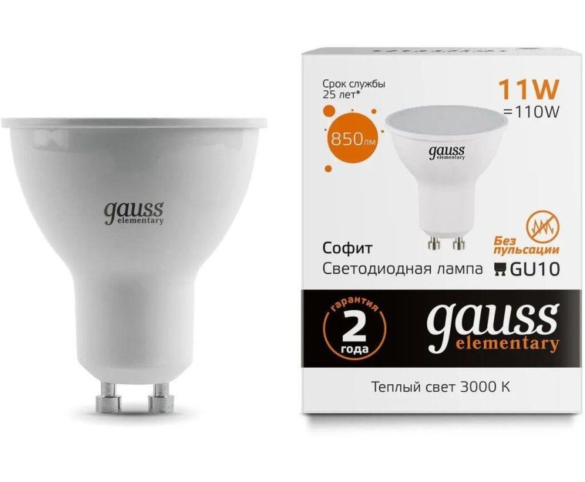 GAUSS Лампа светодиодная Elementary 13611 11Вт цок.:GU10 софит 180B св.свеч.бел.теп. (упак.:1шт)