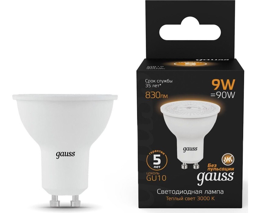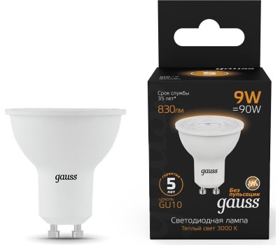 GAUSS Лампа светодиодная 101506109 9Вт цок.:GU10 рефлек. 150B св.свеч.бел.теп. MR16 (упак.:1шт)