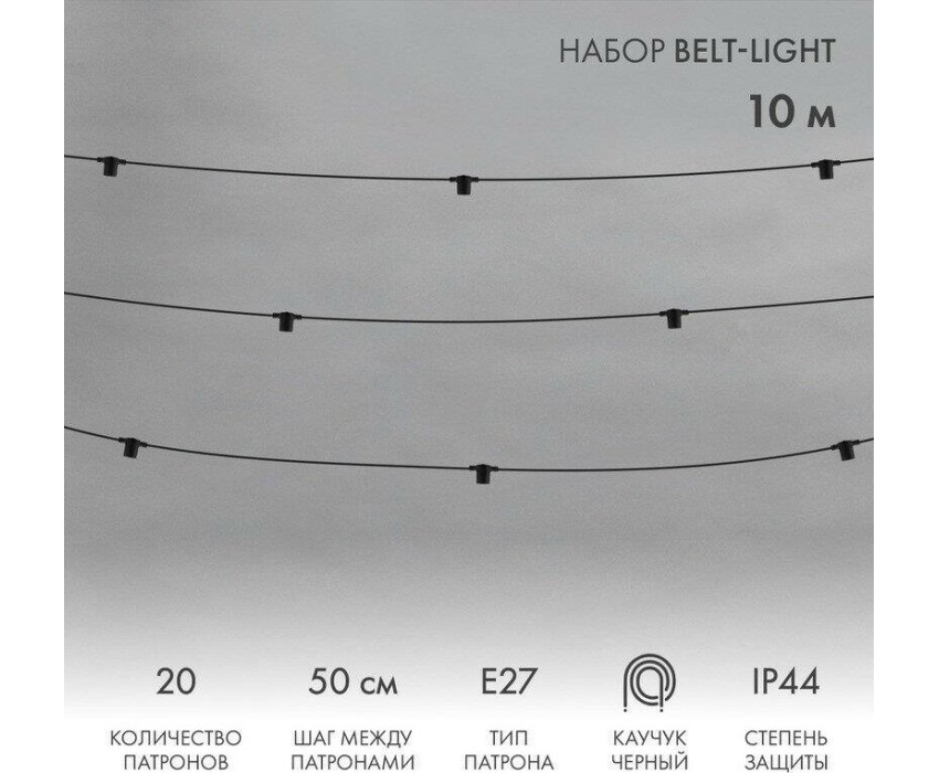 Светильники накладные NEON-NIGHT (331-331) 'Белт-Лайт' 2 жилы 10 м, черный каучук, шаг 50 см, 20 патронов Е27, шнур 3 м, IP44, соединяется