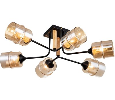 Потолочный светильник 6x60Вт E27, металл/стекло/дерево, чёрный/прозрачный плафон
