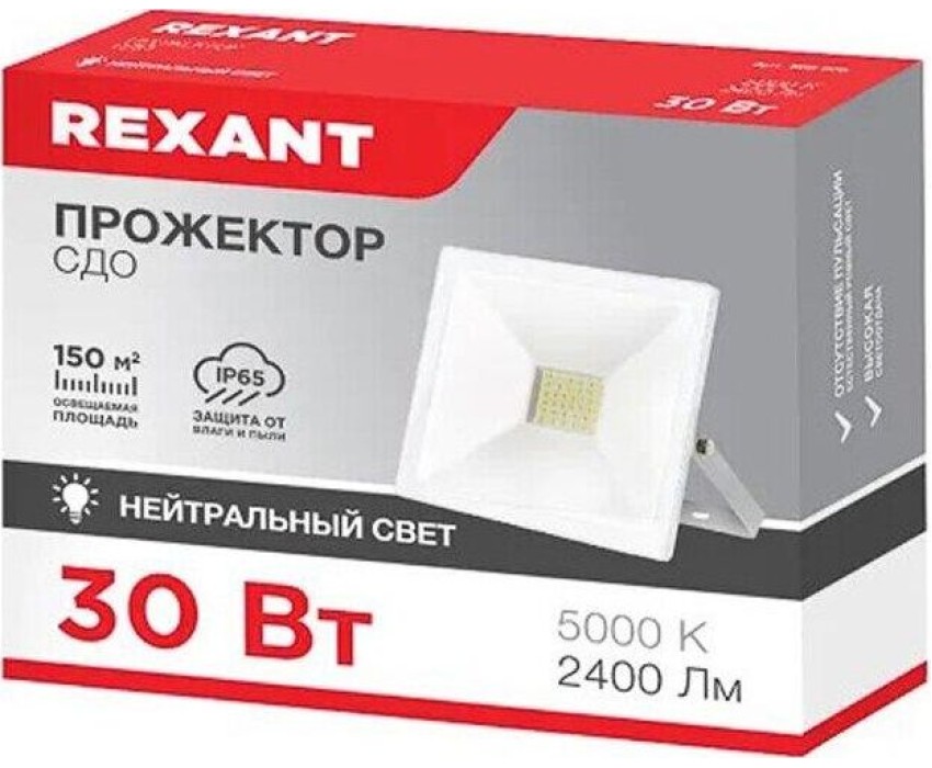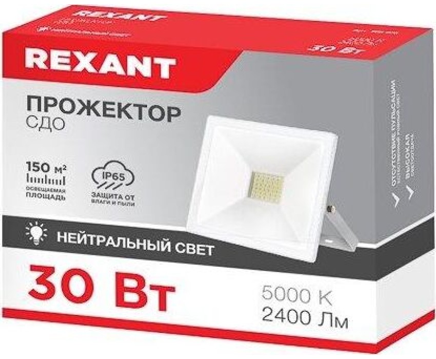Светодиодный прожектор REXANT нейтрального свечения 5000 К с мощностью 30 Вт предназначен для декоративной и фасадной подсветки зданий, подсветки рекламных конструкций, памятников, колонн, деревьев, спортивных сооружений, открытых пространств и объектов.