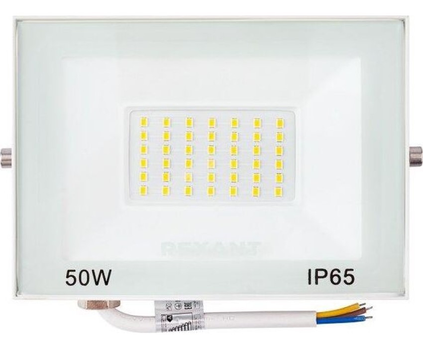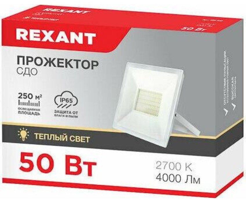Светодиодный прожектор REXANT теплого белого свечения 2700 К с мощностью 50 Вт предназначен для декоративной и фасадной подсветки зданий, подсветки рекламных конструкций, памятников, колонн, деревьев, спортивных сооружений, открытых пространств и объектов.