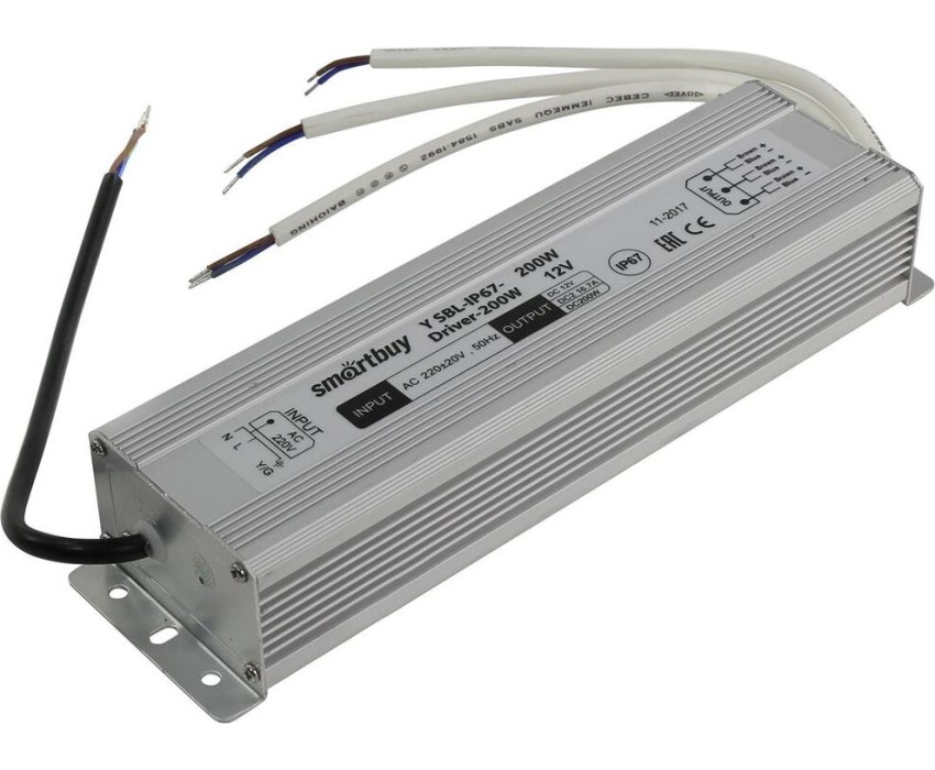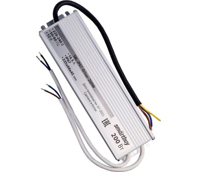 Мощность: 200 Вт, Входное напряжение: 100-240 В Выходное напряжение: 12 В, Сила тока: 16,7А Размеры: 260х69х45 мм, IP67, Алюминиевый корпус