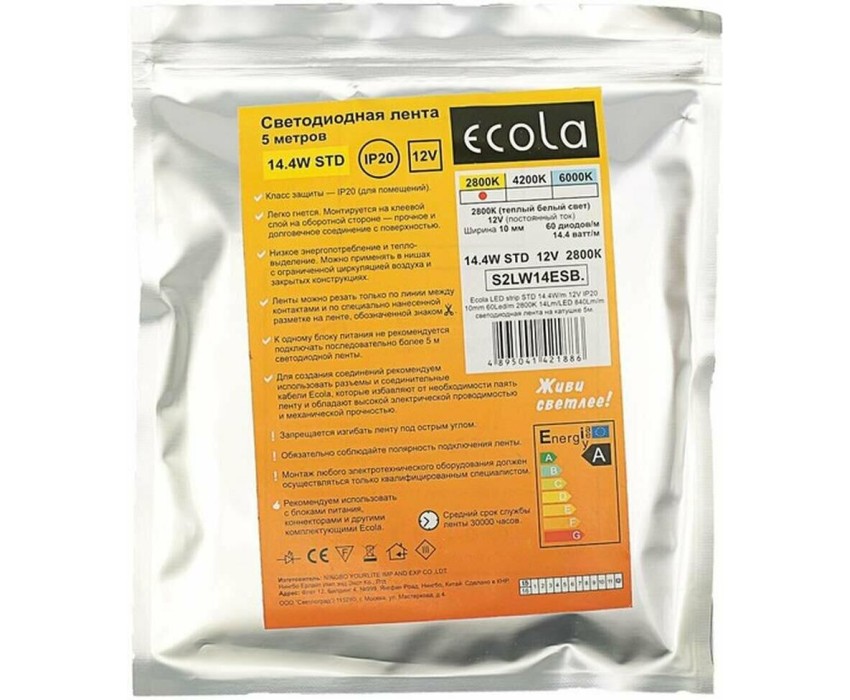Лента светодиодная ECOLA S2LW14ESB 14.4W/m 12V IP20 10mm 2800K светодиодная лента на катушке 5м.