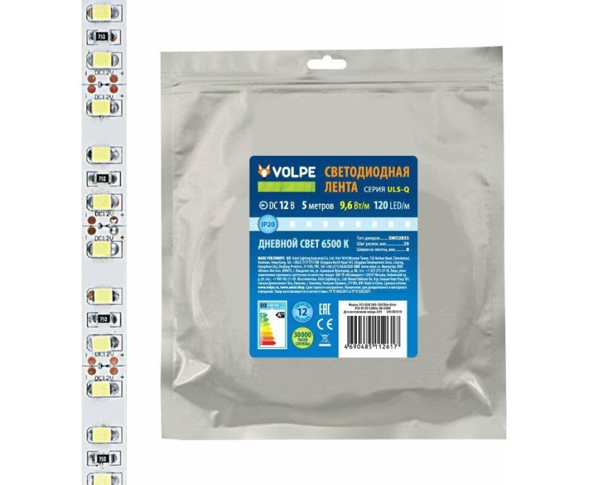 ЭЛЕКТРИКА VOLPE (UL-00004539) ULS-Q330 2835-120LED/m-8mm-IP20-DC12V-9,6W/m-5M-6500K катушка в герметичной упаковке