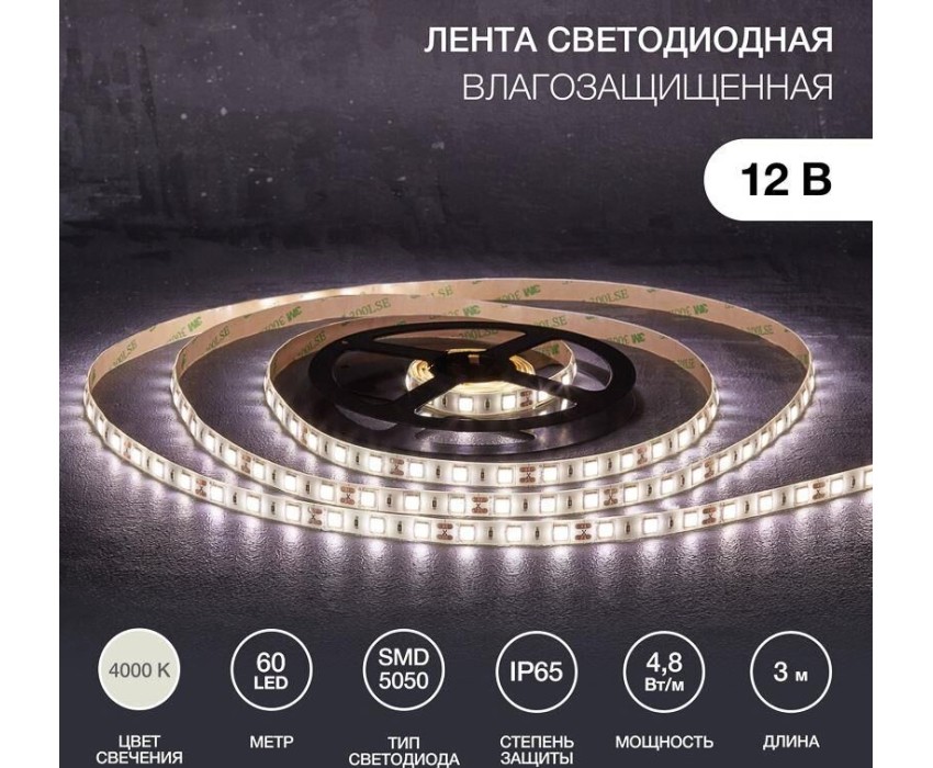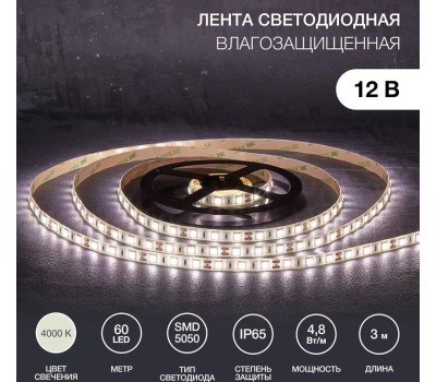 LAMPER Лента светодиодная 12В, SMD5050, 14,4Вт/м, 60 LED/м, 4000К, 10мм, 3м, для БП с клеммами, IP65