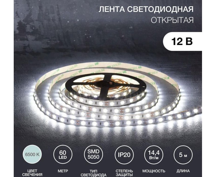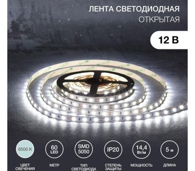 LAMPER Лента светодиодная 12В, SMD5050, 14,4Вт/м, 60 LED/м, 6500К, 10мм, 5м, для БП с клеммами, IP20