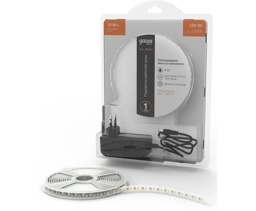 Тип: Лента Бренд: GAUSS Модель: Basic PartNumber/Артикул Производителя: BT044 Класс пылевлагозащиты: IP20 Тип светодиода: SMD 5050 Длина товара: 260 мм Ширина товара: 175 мм Высота товара: 55 мм Длина ленты: 5 м Ширина ленты: 10 мм Количество светодиодов: 60 шт/м Самоклеющаяся: ДА Световой поток: 700 lm Тип крепления: клеевое основание Срок службы: 25000 ч Описание: Комплекты лент — готовое решение для освещения пространства. В состав комплекта входит: светодиодная лента, блок питания, а для RGB ленты, также контроллер и пульт дистанционного управления. Класс защиты от поражения током: III Цвет свечения: белый Мощность: 10 Вт Напряжение питания: 12 В Вес упаковки (ед): 0.25 кг Объем упаковки (ед): 0.00287375 м3 Габариты упаковки (ед) ДхШхВ: 0.275x0.19x0.055 м