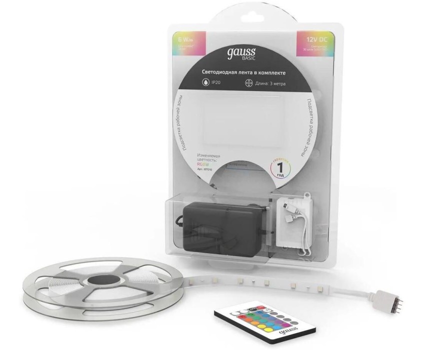 Тип: Лента Бренд: GAUSS Модель: Basic PartNumber/Артикул Производителя: BT010 Класс пылевлагозащиты: IP20 Тип светодиода: SMD 5050 Длина товара: 275 мм Ширина товара: 190 мм Высота товара: 55 мм Длина ленты: 3 м Ширина ленты: 10 мм Количество светодиодов: 60 шт/м Самоклеющаяся: ДА Световой поток: 390 lm Тип крепления: клеевое основание Описание: Комплекты лент — готовое решение для освещения пространства. В состав комплекта входит: светодиодная лента, блок питания, а для RGB ленты, также контроллер и пульт дистанционного управления. Срок службы: 25000 ч Класс защиты от поражения током: III Цвет свечения: RGBW Мощность: 6 Вт Напряжение питания: 12 В Вес упаковки (ед): 0.363 кг Объем упаковки (ед): 0.00287375 м3 Габариты упаковки (ед) ДхШхВ: 0.275x0.19x0.055 м