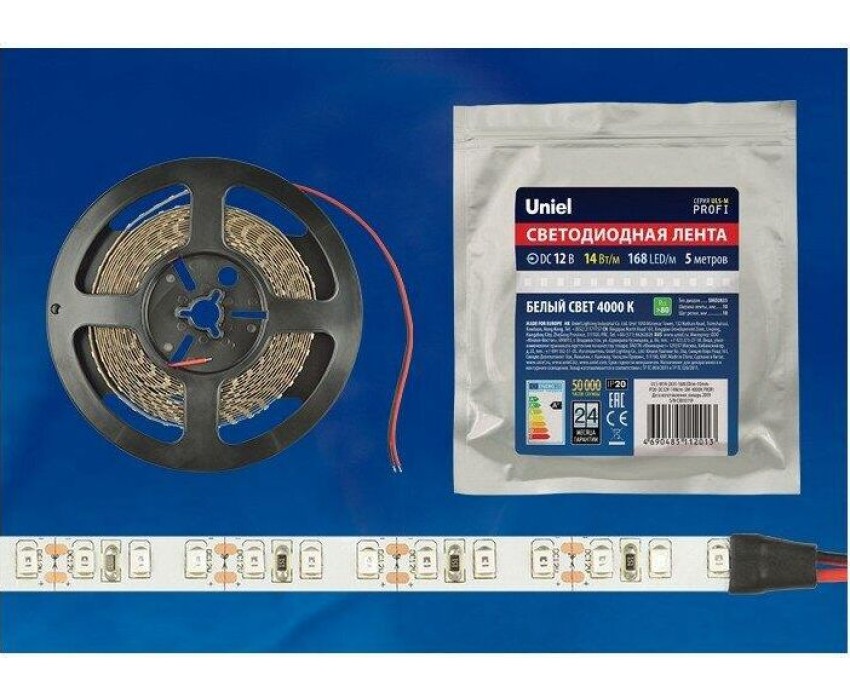 Светодиодная лента UNIEL (UL-00004366) ULS-M14-2835-168LED/m-10mm-IP20-DC12V-14W/m-5M-4000K PROFI катушка в герметичной упаковке