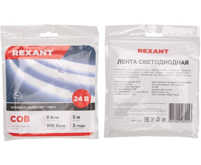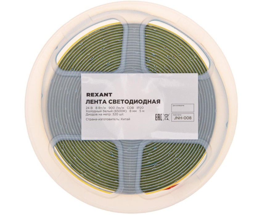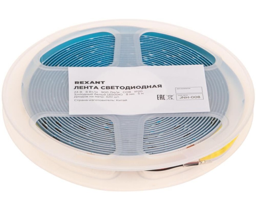 REXANT Лента светодиодная 24В, COB 8Вт/м, 320 LED/м, 6500K, 8мм, 5м, IP20