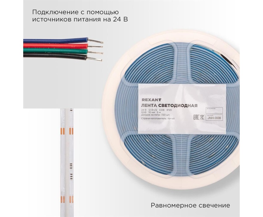 REXANT Лента светодиодная 24В, COB 12Вт/м, 720 LED/м, RGB, 10мм, 5м, IP20