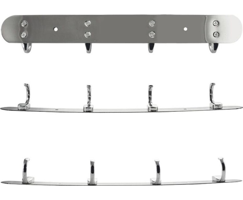 Вешалка - держатель для принадлежностей металлический, хромированный, с четырьмя крючками. Изготовлен из прочной нержавеющей стали марки SUS 304 с хромированным покрытием, которое придает безупречный стильный вид и долговечность. Хромированное покрытие очень стойко переносит истирания и обеспечивает зеркальный блеск изделия. На держателе с легкостью можно размещать вещи для сушки или вешать, как полотенца, так и одежду перед походом в душ. Идеально подойдет не только для ванной, но и для кухни, а также для дачи или гаража - при необходимости на держатель можно вешать любые предметы. Изделие крепится к стене с помощью дюбелей и саморезов (входят в комплект). Габаритные размеры: длина 320 мм, высота 50 мм, глубина 55 мм. Вес - 0,260 кг, объём - 0,00110 м3.