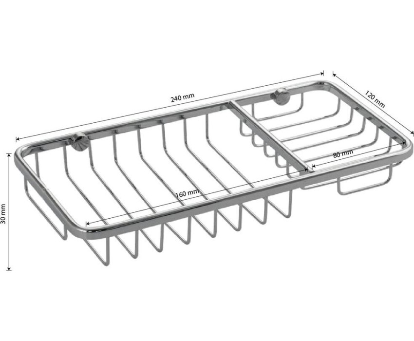 Мыльница подвесная, настенная, большая, двухсекционная, прямоугольной формы, решетка, хромированная. Материал изготовления нержавеющая сталь. Хромированное покрытие очень стойко переносит истирания и обеспечивает зеркальный блеск изделия. Сетчатый каркас не позволяет влаге скапливаться, поэтому мыло долгое время сохраняет свою форму. Идеально подойдет не только для ванной, но и для кухни. Изделие крепится к стене с помощью дюбелей и саморезов (входят в комплект). Габаритные размеры: ширина 240 мм, глубина 120 мм, высота 30 мм. Вес - 0,400 кг, объём - 0,00150 м3.
