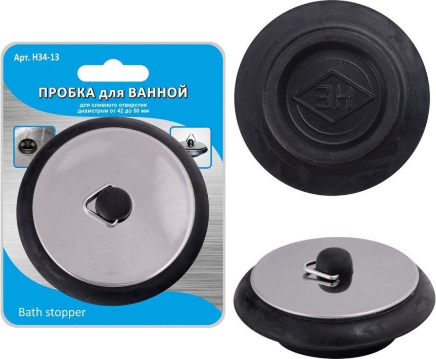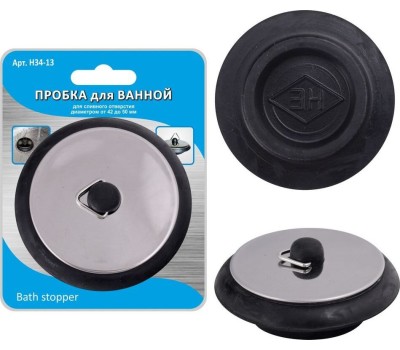 Пробка для ванной H34-13 Материал: Пластмасса, Металл (Нерж.сталь) Подходит для сливного отверстия диаметром от 42 до 50 мм.