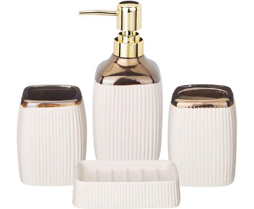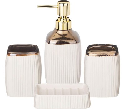 Набор аксессуаров для ванной комнаты состоит из дозатора для жидкого мыла, подставки-стакана, подставки для зубных щёток и мыльницы для кускового мыла.