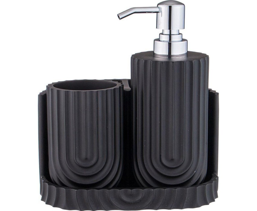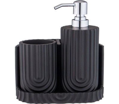 Набор аксессуаров для ванной комнаты состоит из дозатора для жидкого мыла, стакана и подставки.