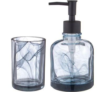 Набор аксессуаров для ванной комнаты состоит из дозатора для жидкого мыла и подставки-стакана.