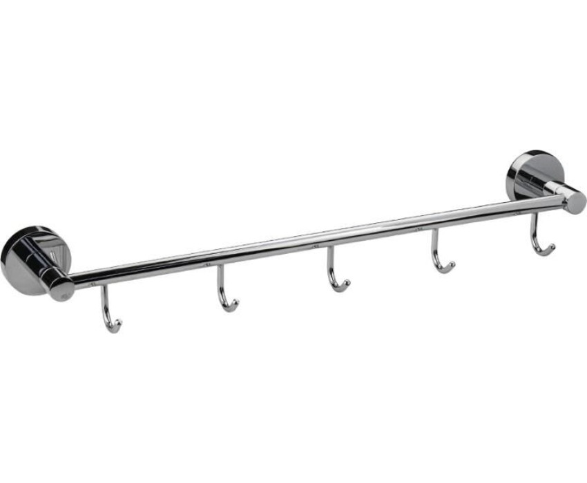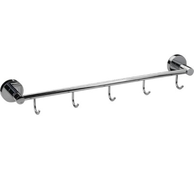 Держатель для полотенец металлический, хромированный с пятью крючками. Материал изготовления — ЦАМ (цинк-алюминий-медь) + нержавеющая сталь. Хромированное покрытие очень стойко переносит истирания и обеспечивает зеркальный блеск изделия. На держателе с легкостью можно размещать вещи для сушки или вешать, как полотенца, так и одежду перед походом в душ. Идеально подойдет не только для ванной, но и для кухни, а также для дачи или гаража - при необходимости на держатель можно вешать любые предметы. Изделие крепится к стене с помощью дюбелей и саморезов (входят в комплект). Габаритные размеры: длина 475 мм, глубина 90 мм, высота 60 мм, диаметр посадочного седла 50 мм. Вес - 0.49 кг, объём - 0.00347 м3.