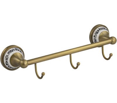 Держатель для полотенец металлический, с тремя крючками,с керамической вставкой с орнаментом. Материал изготовления — ЦАМ. Бронзовое, матовое покрытие очень стойко переносит истирания и обеспечивает безупречный стильный вид изделия и долговечность. На держателе с легкостью можно размещать вещи для сушки или вешать, как полотенца, так и одежду перед походом в душ. Идеально подойдет не только для ванной, но и для кухни, а также для дачи или гаража - при необходимости на держатель можно вешать любые предметы. Изделие крепится к стене с помощью дюбелей и саморезов (входят в комплект). Габаритные размеры: длина 355 мм, высота 80 мм, глубина 105 мм, основание 68 мм. Вес - 0.68 кг, объём - 0.00431 м3