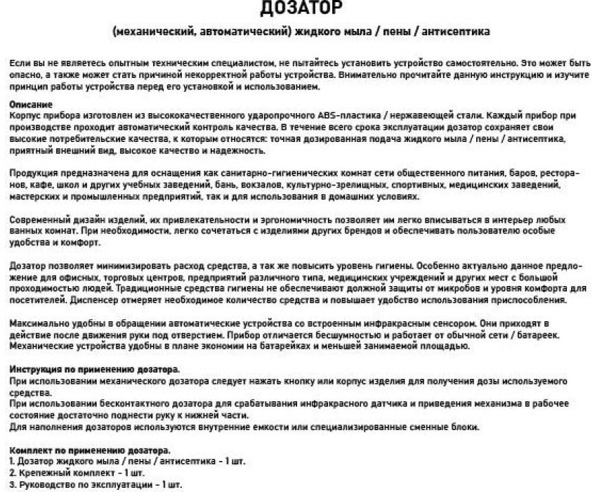 Механический дозатор для пены предназначен для установки в любых санитарно-гигиенических комнатах. Имеет ключ и пластиковый замок. Дозатор прост в эксплуатации, достаточно нажать на кнопку для получения порции средства. Для удобства контроля за уровнем мыла на лицевой поверхности есть смотровое окно в виде капли. Корпус диспенсера изготовлен из прочного пластика АБС белого цвета, который выдерживает различные механические воздействия. В резервуар емкостью 1000 мл можно заливать как мыльную пену, так и прочие средства. Разместив диспенсер на стене, достаточно время от времени проверять заполненность резервуара. Иного ухода он не требует, не нуждается в замене батареек. Это отличное решение как для частных владений, так и для гостиниц, кафе, столовых и прочих общественных мест. Габаритные размеры: высота 250 мм, ширина 115 мм, глубина 100 мм. Вес - 0,600 кг, объем - 0,00400 м3.