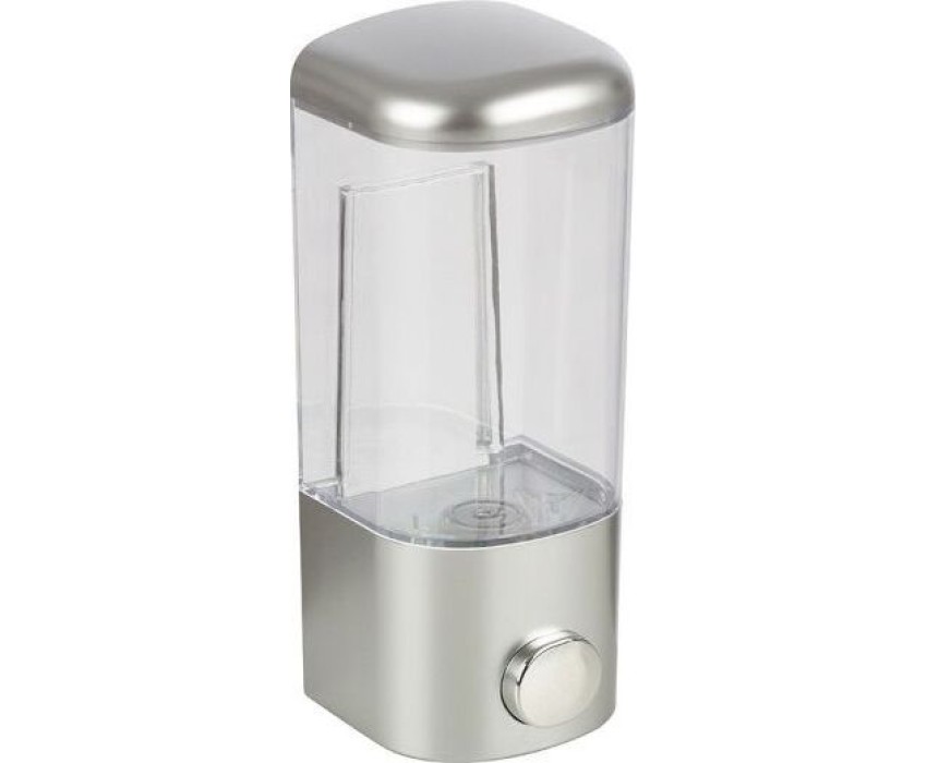 Нажимной диспенсер для мыла Корпус из пластика, прозрачная емкость для мыла, Цвет матовый хром Размер: 9*8*20 см Емкость: 450 мл Материал: полистирол, ABS пластмасса Крепится к стене
