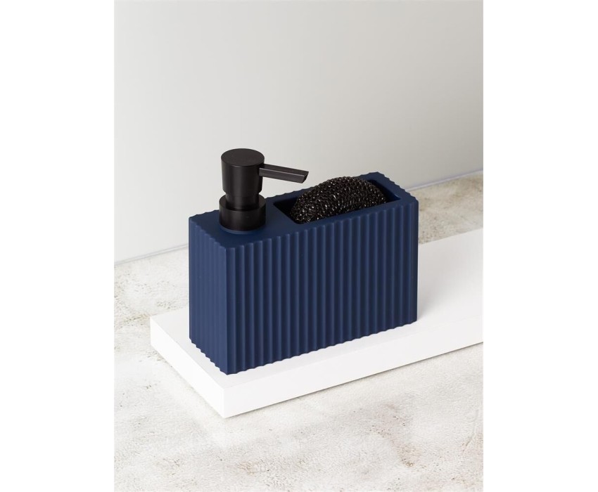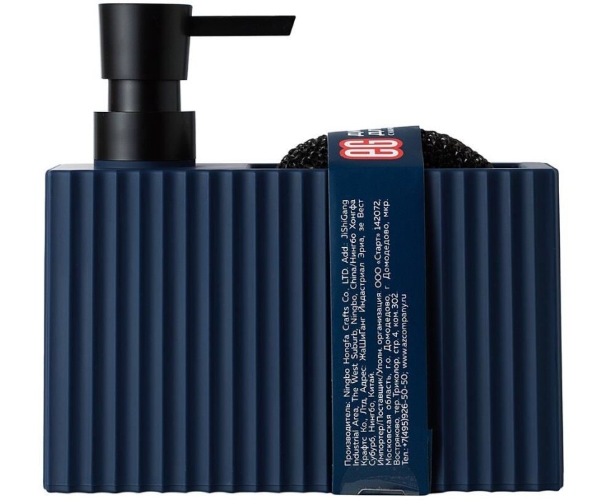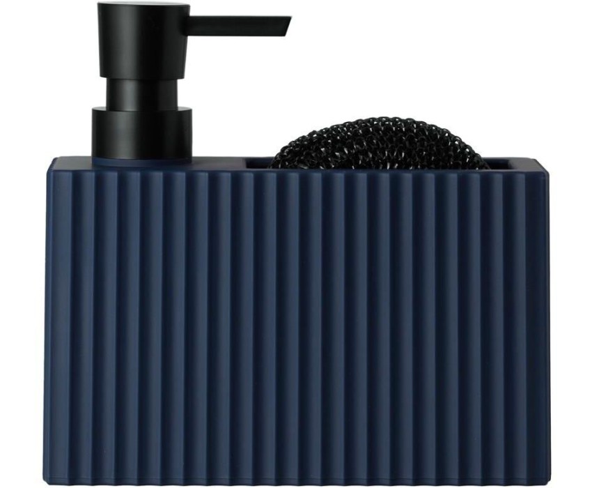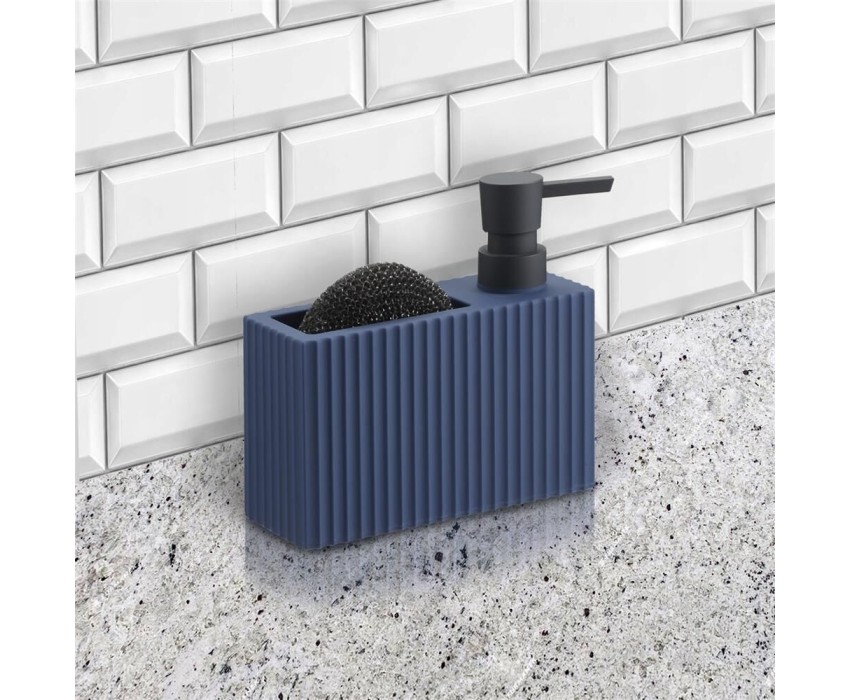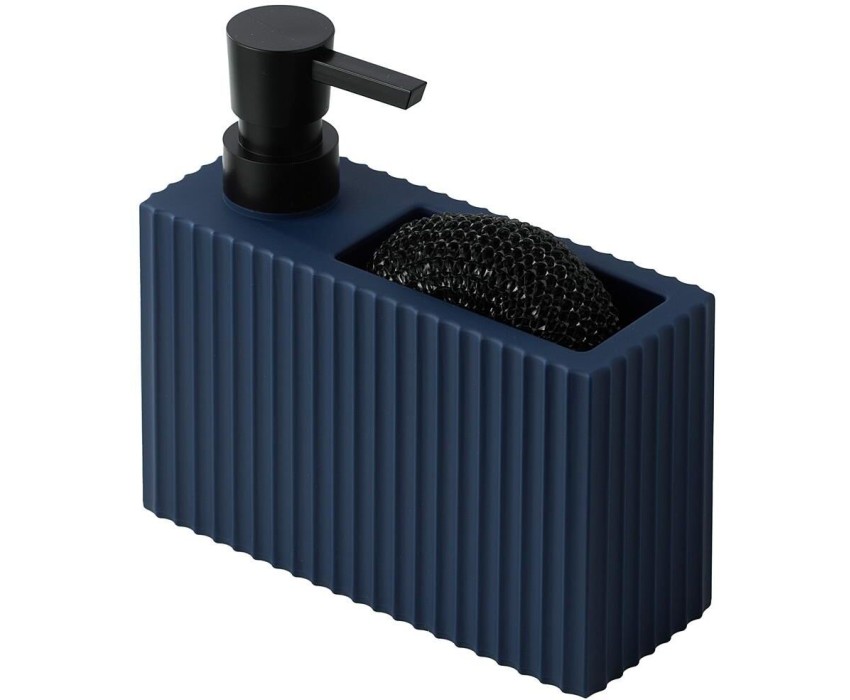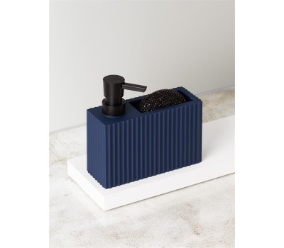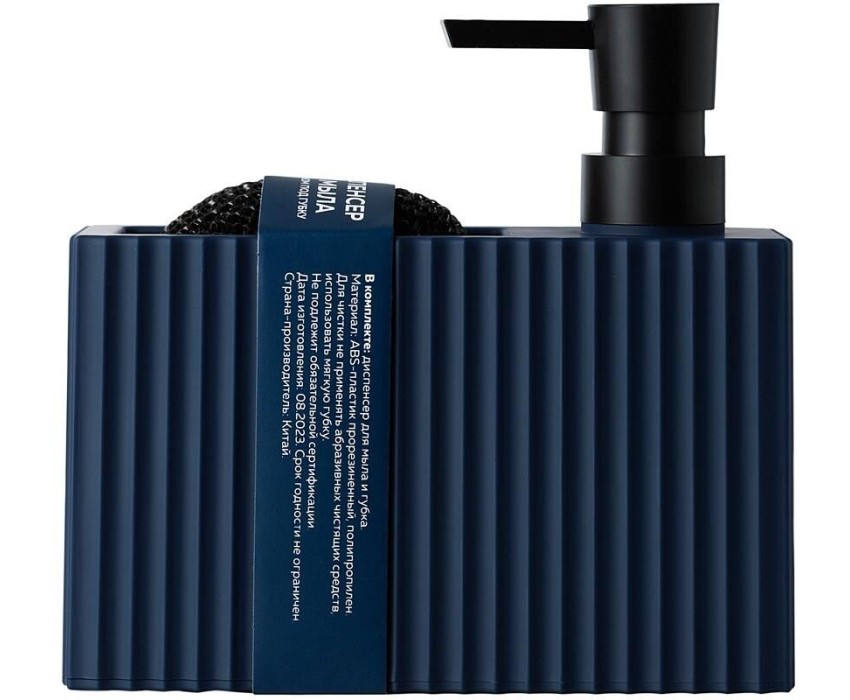 Диспенсер для мыла с карманом под губку Отсек для хранения губки Прорезиненное покрытие Губка в комплекте Материал: ABS-пластик прорезиненный, полипропилен. Размер: 16,5 х 6 х 15,5 см Объем дозатора: 220 мл Цвет: синий