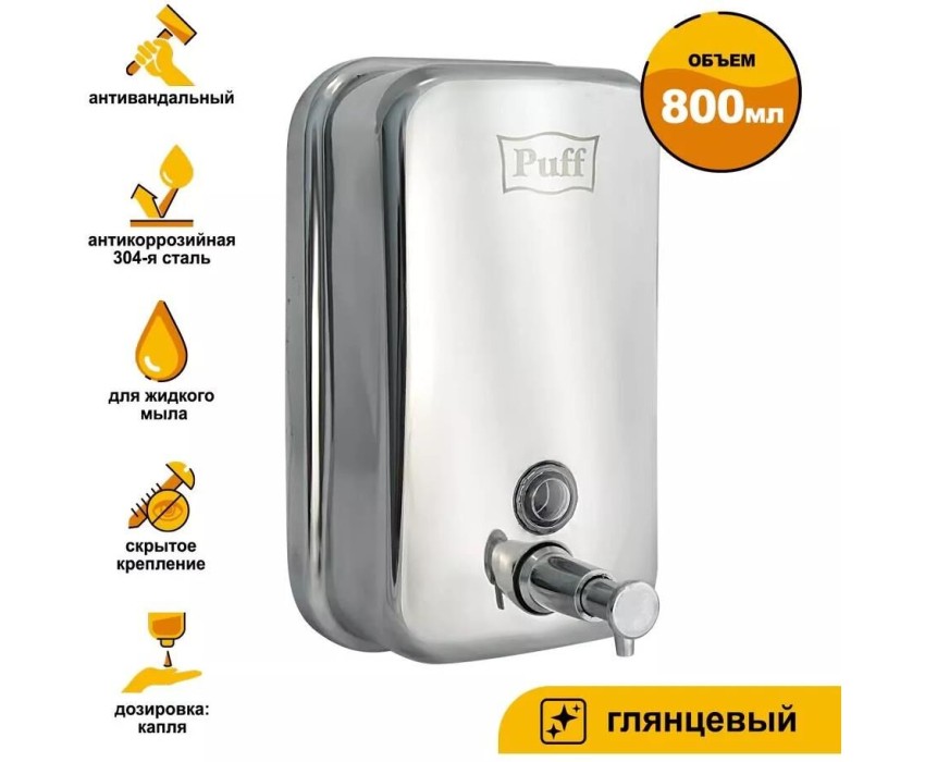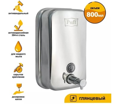 Дозатор PUFF Дозатор для жидкого мыла из нерж. стали -8608, хром, 800 мл, глянцевый, 19х12х12 см