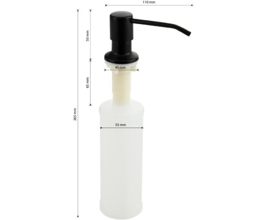 Дозатор для жидкого мыла и моющих средств, чёрный, врезной, можно установить на кухонную мойку, если в ней предусмотрено место под встраиваемый дозатор, или на столешницу в любом удобном месте. Антивандальный корпус дозатора изготовлен из высокопрочного ABS-пластика и нержавеющей стали. Требуемое отверстие для установки встраиваемого дозатора не менее 25 мм. Это очень удобный и полезный аксессуар на кухне. Наполнять его жидким моющим средством несложно, нужно просто снять верхнюю часть дозатора и залить требуемое количество жидкого мыла в колбу, емкостью 300 мл. Последовательно нажимая на верхнюю часть дозатора, Вы получаете требуемое количество моющего средства. Габаритные размеры: высота 265 мм, ширина 110 мм, диаметр посадочного седла 40 мм, длины резьбы 65 мм. Вес - 0,150 кг, объем - 0,00150 м3.