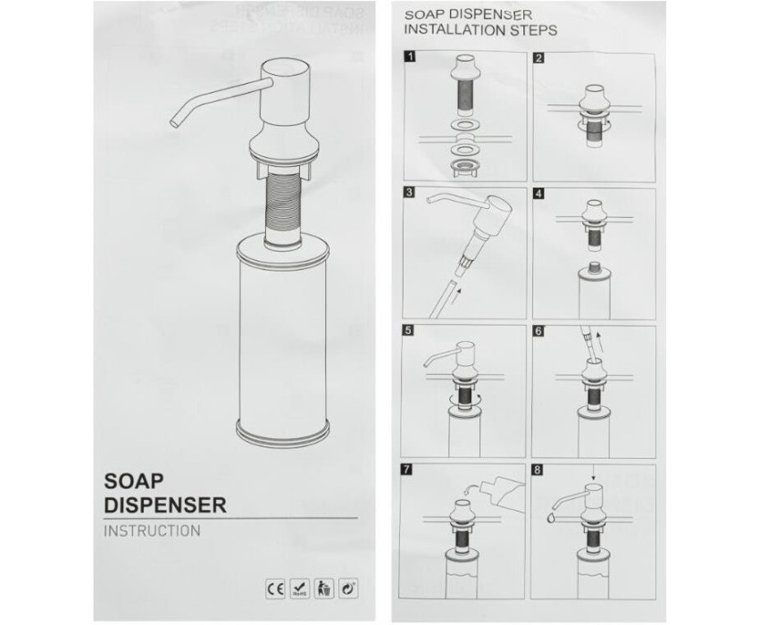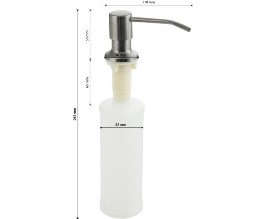 Дозатор для жидкого мыла и моющих средств, матовый хром, врезной, можно установить на кухонную мойку, если в ней предусмотрено место под встраиваемый дозатор, или на столешницу в любом удобном месте. Антивандальный корпус дозатора изготовлен из высокопрочного ABS-пластика и нержавеющей стали Требуемое отверстие для установки встраиваемого дозатора не менее 25 мм. Это очень удобный и полезный аксессуар на кухне. Наполнять его жидким моющим средством несложно, нужно просто снять верхнюю часть дозатора и залить требуемое количество жидкого мыла в колбу, емкостью 300 мл. Последовательно нажимая на верхнюю часть дозатора, Вы получаете требуемое количество моющего средства. Габаритные размеры: высота 265 мм, ширина 110 мм, диаметр посадочного седла 40 мм, длины резьбы 65 мм. Вес - 0,150 кг, объем - 0,00150 м3.