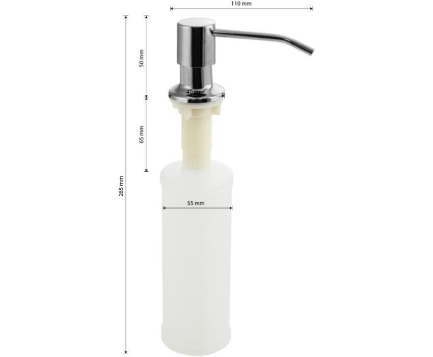 Дозатор для жидкого мыла и моющих средств, хромированный, врезной, можно установить на кухонную мойку, если в ней предусмотрено место под встраиваемый дозатор, или на столешницу в любом удобном месте. Антивандальный корпус дозатора изготовлен из высокопрочного ABS-пластика и нержавеющей стали. Требуемое отверстие для установки встраиваемого дозатора не менее 25 мм. Это очень удобный и полезный аксессуар на кухне. Наполнять его жидким моющим средством не сложно, нужно просто снять верхнюю часть дозатора и залить требуемое количество жидкого мыла в колбу, емкостью 300 мл. Последовательно нажимая на верхнюю часть дозатора, Вы получаете требуемое количество моющего средства. Габаритные размеры: высота 265 мм, ширина 110 мм, диаметр посадочного седла 40 мм, длины резьбы 65 мм. Вес - 0,150 кг, объем - 0,00150 м3.