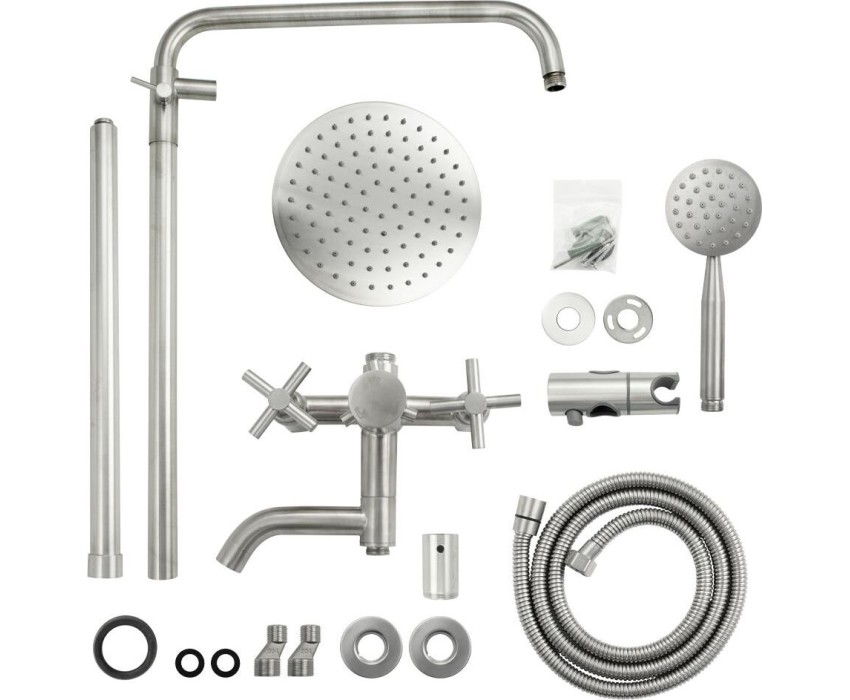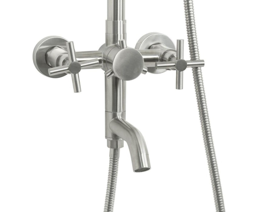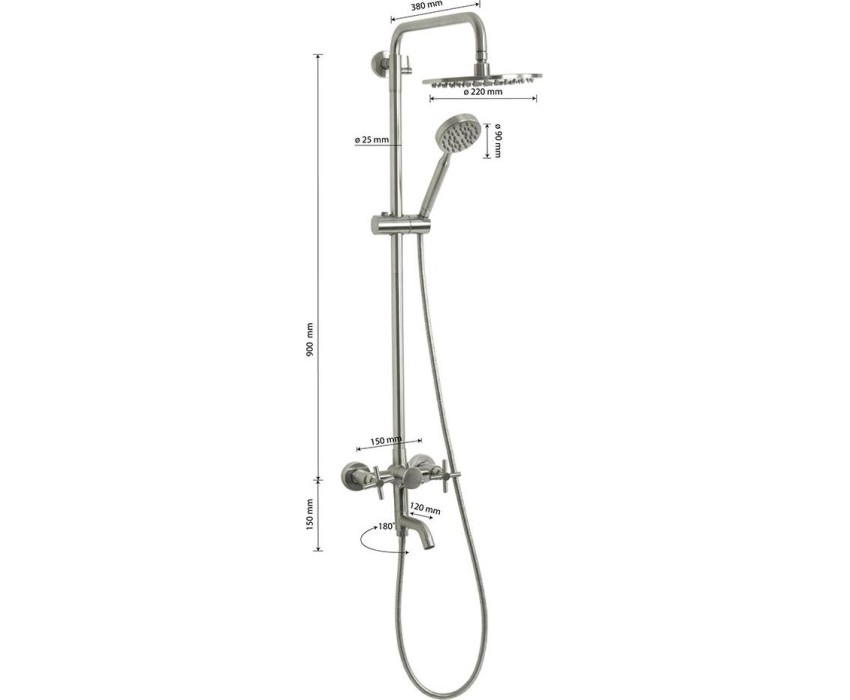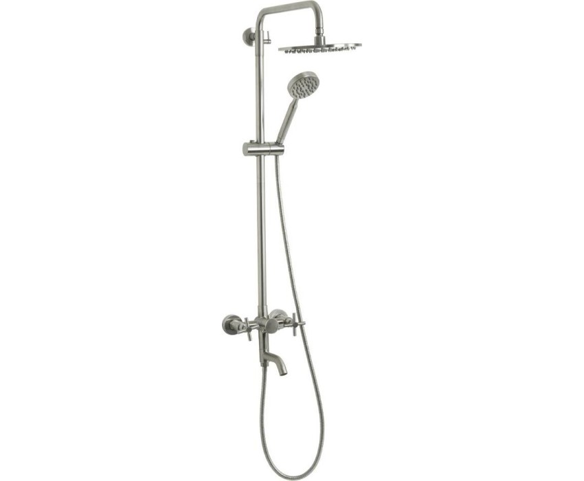 Смеситель + стойка душевая телескопическая "тропический душ" с двумя лейками, металлокерамика, в ванную / душевую комнату, матовая, из нержавеющей стали марки 304. Смеситель м/к с коротким поворотным изливом, душевым шлангом и лейкой, дивертор переключения в трёх положениях. Кранбукса м/к, ручка крест, аэратор для экономии воды, чашки и эксцентрики. Душевая, регулируемая по высоте стойка с присоединением к корпусу смесителя и дополнительным креплением к стене и большой круглой лейкой с эффектом тропического душа. Габаритные размеры: ширина смесителя 150 мм, высота корпуса 150 мм, длина излива корпуса 120 мм, высота телескопической стойки 900 мм, длина излива стойки 380 мм, круглая душевая лейка d = 90 мм, круглая лейка тропический душ d = 220 мм, шланг 150 см. Вес - 4,400 кг, объём - 0,03630 м3. В комплекте корпус с изливом, чашки, эксцентрики, прокладки, стойка, дивертор, шланг, две лейки, крепления.