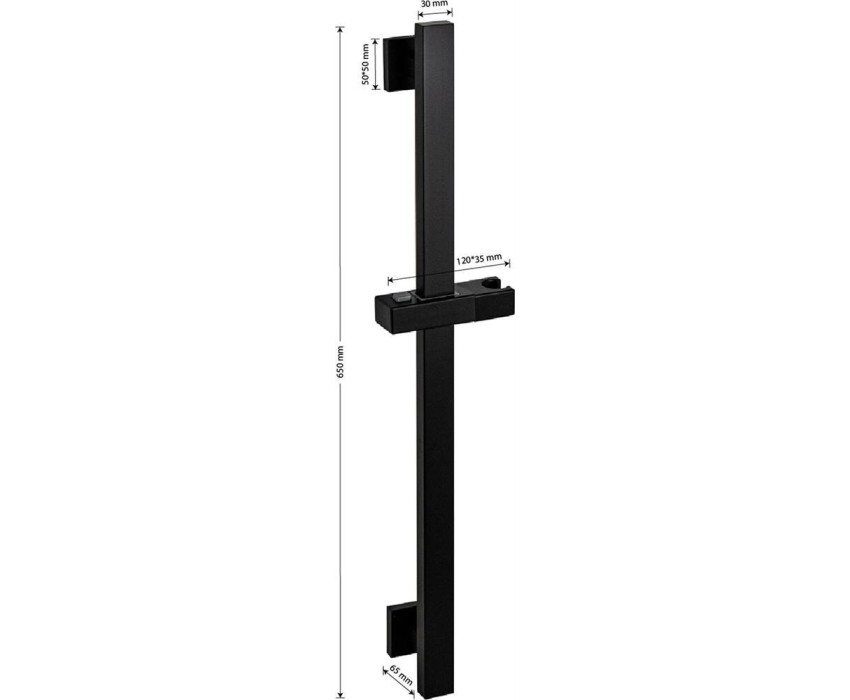 Душевая стойка, матовая, квадратный профиль, цвет черный, произведена из нержавеющей стали марки 304, устойчивой к агрессивному воздействию внешней среды и механическим деформациям, держатель для душа с механической фиксацией и регулировкой по высоте. Размеры: высота штанги 650 мм, глубина 65 мм, ширина трубы 30 мм, крепление 50*50 мм. Вес - 0.87 кг, объ м - 0.0085 м3. В комплекте душевая штанга, крепления, держатель душевой лейки.