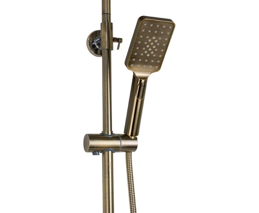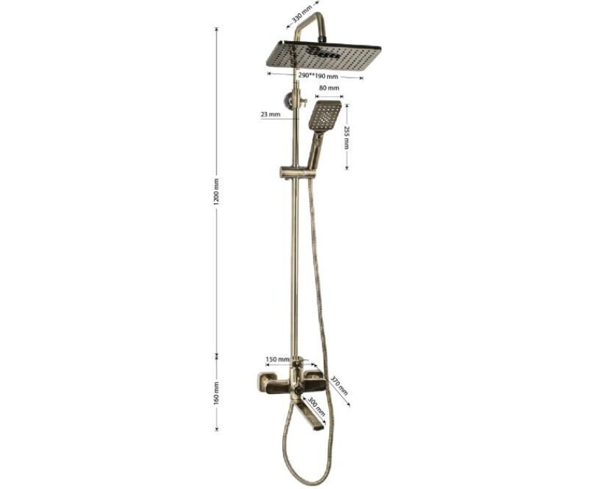 Смеситель + стойка душевая телескопическая "тропический душ" с двумя лейками в ванную / душевую комнату, цвет бронза. Смеситель шаровый с длинным поворотным изливом, душевым шлангом и лейкой, дивертор переключения в трёх положениях. Материал изготовления — цам. Картридж d = 40 мм, ручка литая, аэратор для экономии воды, чашки и эксцентрики. Душевая, регулируемая по высоте стойка с присоединением к корпусу смесителя и дополнительным креплением к стене и большой круглой лейкой с эффектом тропического душа. Габаритные размеры: ширина смесителя 150 мм, высота 160 мм, длина излива корпуса 300 мм, высота телескопической стойки 800 -1200 мм, длина излива стойки 330 мм, душевая лейка 80*255 мм, круглая лейка тропический душ 290*190 мм, шланг 150 см. Вес - 4,58 кг, объём - 0,02847 м3. В комплекте корпус с изливом, чашки, эксцентрики, прокладки, стойка, дивертор, шланг, две лейки, крепления.