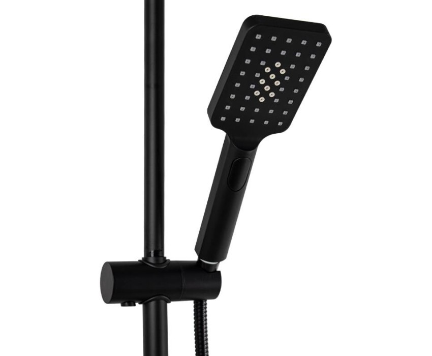 Смеситель + стойка душевая телескопическая "тропический душ" с двумя лейками в ванную / душевую комнату, чёрного цвета. Смеситель шаровый с длинным поворотным изливом, душевым шлангом и лейкой, дивертор переключения в трёх положениях. Материал изготовления — латунь. Картридж d = 40 мм, ручка литая, аэратор для экономии воды, чашки и эксцентрики. Душевая, регулируемая по высоте стойка с присоединением к корпусу смесителя и дополнительным креплением к стене и большой круглой лейкой с эффектом тропического душа. Габаритные размеры: ширина смесителя 150 мм, высота 160 мм, длина излива корпуса 340 мм, высота телескопической стойки 800-1100 мм, длина излива стойки 330 мм, круглая душевая лейка 190*290 мм, круглая лейка тропический душ 255*80 мм, шланг 150 см. Вес - 4,3 кг, объём - 0,02683 м3. В комплекте корпус с изливом, чашки, эксцентрики, прокладки, стойка, дивертор, шланг, две лейки, крепления.
