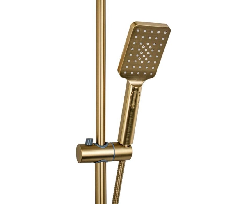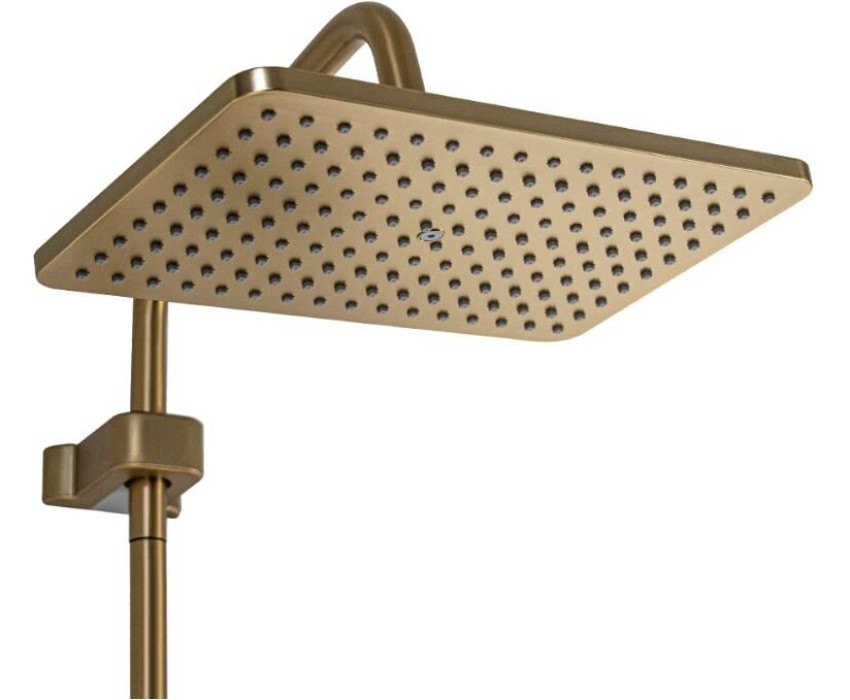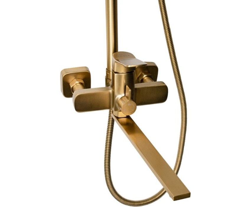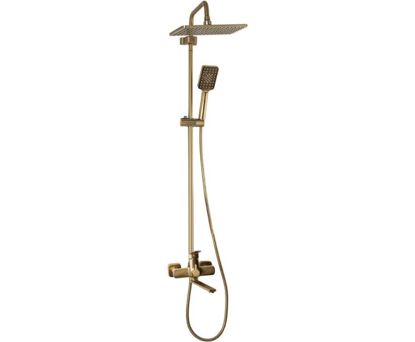 FABIA - Смеситель + стойка душевая "тропический душ", с двумя лейками, с длинным изливом, цвет МАТОВОЕ ЗОЛОТО. 9878