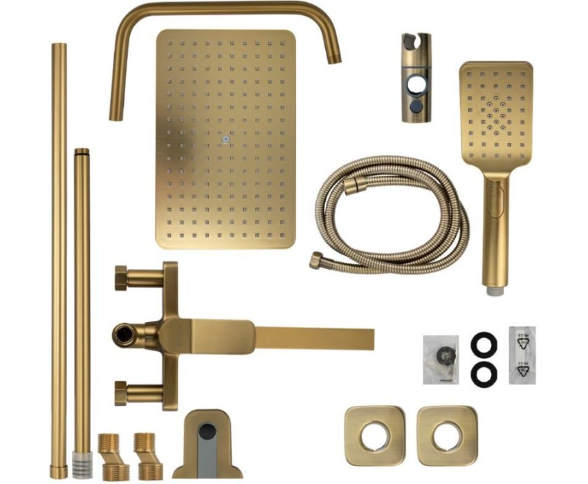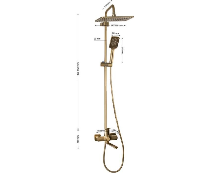 Смеситель + стойка душевая телескопическая "тропический душ" с двумя лейками в ванную / душевую комнату, цвет матовое золото. Смеситель шаровый с длинным поворотным изливом, душевым шлангом и лейкой, дивертор переключения в трёх положениях. Материал изготовления — цам. Картридж d = 40 мм, ручка литая, аэратор для экономии воды, чашки и эксцентрики. Душевая, регулируемая по высоте стойка с присоединением к корпусу смесителя и дополнительным креплением к стене и большой круглой лейкой с эффектом тропического душа. Габаритные размеры: ширина смесителя 150 мм, высота 160 мм, длина излива корпуса 360 мм, высота телескопической стойки 800-1120 мм, длина излива стойки 310 мм, душевая лейка 80*250 мм, прямоугольная лейка тропический душ 290*190 мм, шланг 150 см. Вес - кг, объём - м3. В комплекте корпус с изливом, чашки, эксцентрики, прокладки, стойка, дивертор, шланг, две лейки, крепления.