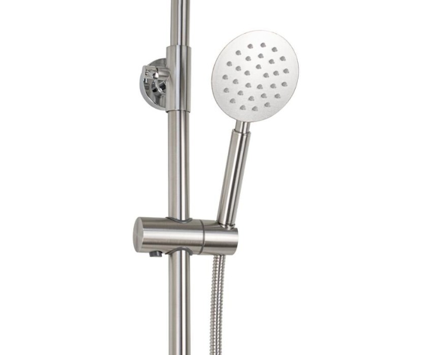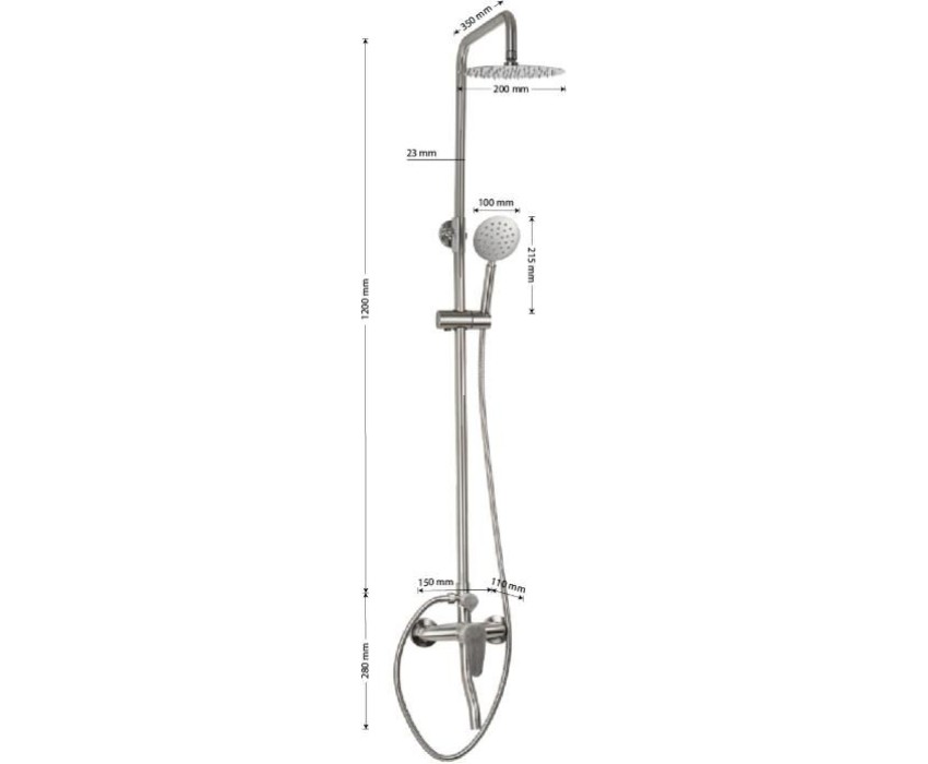 Смеситель + стойка душевая телескопическая "тропический душ", с двумя круглыми лейками в ванную / душевую комнату, матовая, из нержавеющей стали марки SUS 304. Смеситель шаровый с коротким поворотным изливом, душевым шлангом и лейкой, дивертор переключения в трёх положениях. Картридж d = мм, ручка литая, аэратор для экономии воды, чашки и эксцентрики. Душевая, регулируемая по высоте стойка с присоединением к корпусу смесителя и дополнительным креплением к стене и большой круглой лейкой с эффектом тропического душа. Габаритные размеры: ширина смесителя 150 мм, высота смесителя 280 мм, высота телескопической стойки 1200 мм, длина излива стойки 350 мм, круглая душевая лейка d = 100 мм, круглая лейка тропический душ d = 200 мм, шланг 150 см. Вес - 4 кг, объём - 0,02901 м3. В комплекте корпус с изливом, чашки, эксцентрики, прокладки, стойка, дивертор, шланг, две лейки, крепления.